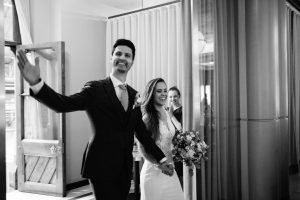 A su llegada, los invitados los esperaban emocionados, y el momento en que subieron las escaleras al compás de la música en vivo de un saxofonista fue verdaderamente memorable.